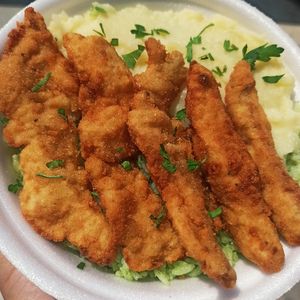 Porção de churrasquinho misto (frango, linguiça e frango)com fritas500g