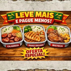 COMBO PERFEITO – LEVE MAIS E PAGUE MENOS! São 3 Marmitex médias (750ml) bem servidas! • Cada Marmitex acompanha 1 mistura, podendo escolher entre: Frango Grelhado Calabresa Bisteca Suína Total: 3 misturas (1 para cada Marmitex). Todas acompanham: Arroz - Feijão - Batata frita - Salada 💥 Combo perfeito para dividir ou garantir várias refeições completas!