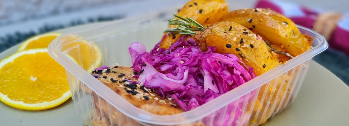 120g de lombo suíno 70g de batata rustica 80g de arroz branco 20g de salada de repolho roxo 1 concha de molho de laranja
